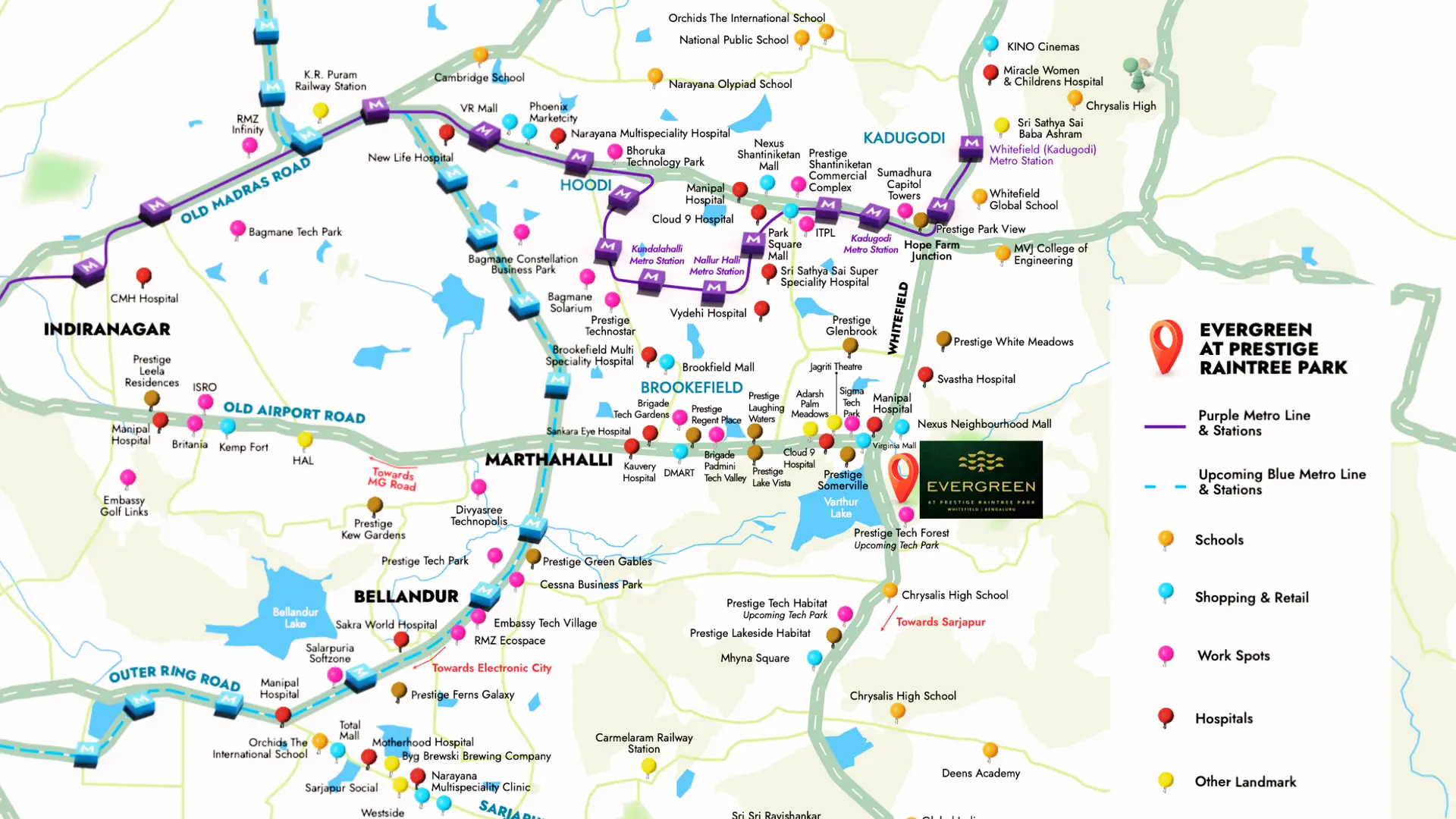 Prestige Evergreen is part of the iconic Prestige Raintree Park, a large mixed-use township planned in the rapidly developing Whitefield–Varthur corridor. Designed for modern urban living, the project blends contemporary architecture, green landscapes, and premium amenities.